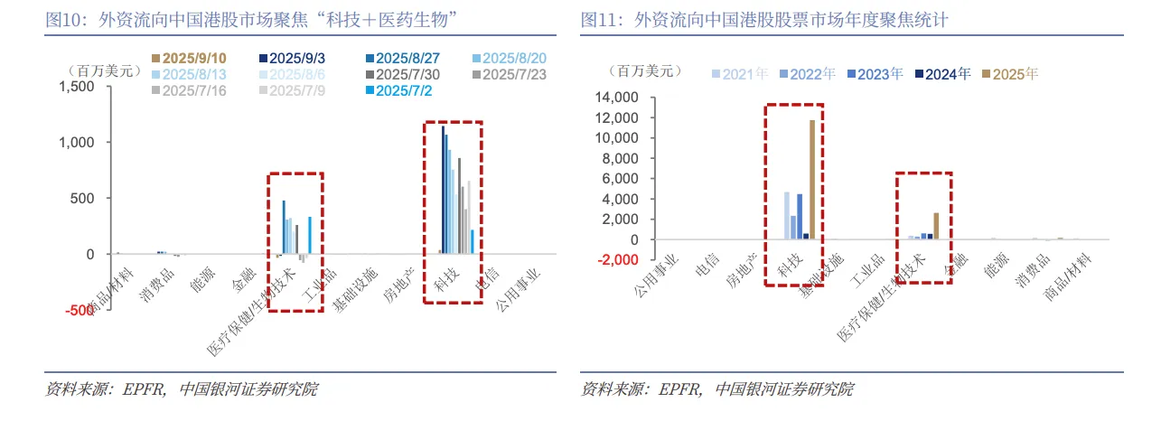 另一方面,8月以来外资配置港股偏好聚焦行业。在美联储降息的背景下,外资对中国香港市场的配置偏好呈现出明显的结构性特征,主要集中在科技、金融及部分消费与制造行业,尤其是科技和医药板块。