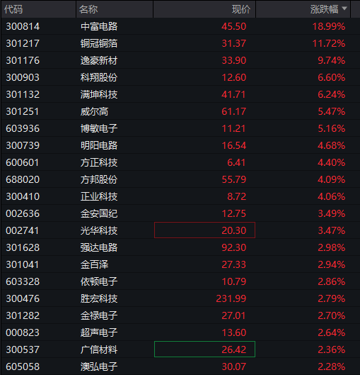 电路板概念股集体走高,中富电路、铜冠铜箔涨超10%,逸豪新材、科翔股份、满坤科技、威尔高等纷纷上涨。