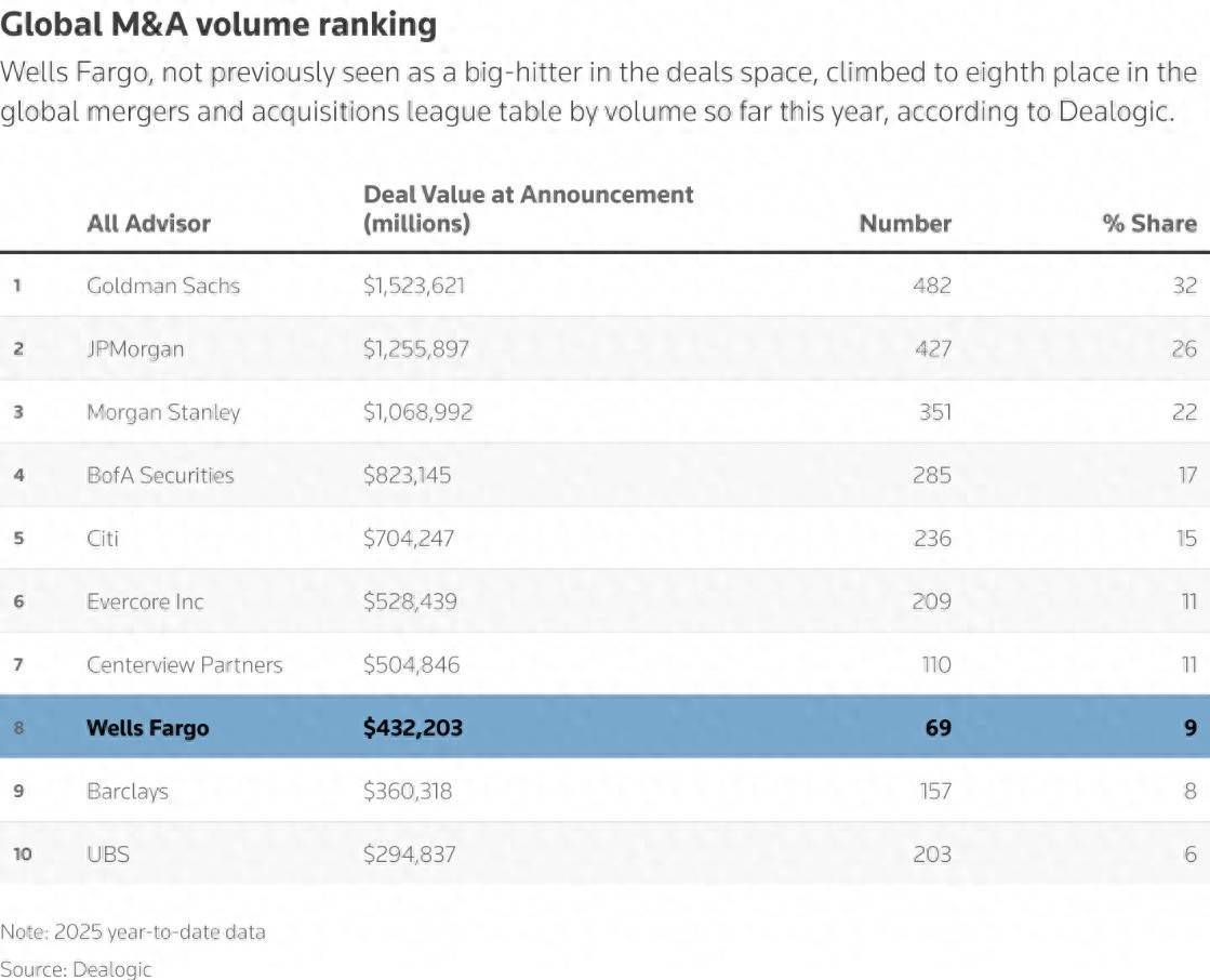 根据Dealogic的初步统计数据,此前在并购市场表现并不突出的富国银行,以交易量来衡量,今年截至目前已在全球并购排行榜上跃升至第八位。要知道,其在2024年全年还仅位列第17位,如此大幅的排名提升,在所有大型银行中独占鳌头。