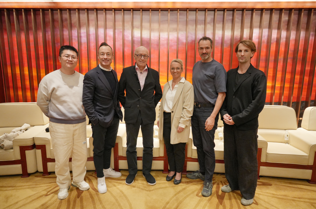 从左至右:上海文化广场剧院管理有限公司总经理 费元洪、《莫扎特!》剧本/歌词 米歇尔·昆策、《莫扎特!》制作人 丽芙·艾琳·弗兰西斯、维也纳联合剧院音乐剧艺术总监 克里斯蒂安·斯图派克、编舞 西蒙·艾肯博格、视频设计 米歇尔·巴尔加维