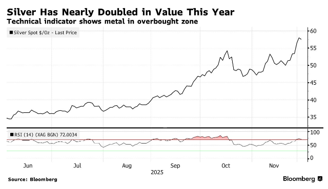 截至发稿,白银交易价格约为每盎司56.98美元,较前一交易日创下的历史峰值下跌近2美元。交易员此前押注供应紧张局面将持续乐融配,且美联储有望再次降息,这一预期为无收益贵金属提供了上涨动力。